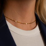 LEONORA halskæden er også vandfast, hvilket betyder at den sagtens kan haves på i badet, til træning osv. uden at den mister farven. (OBS. i min. 6 måneder)
